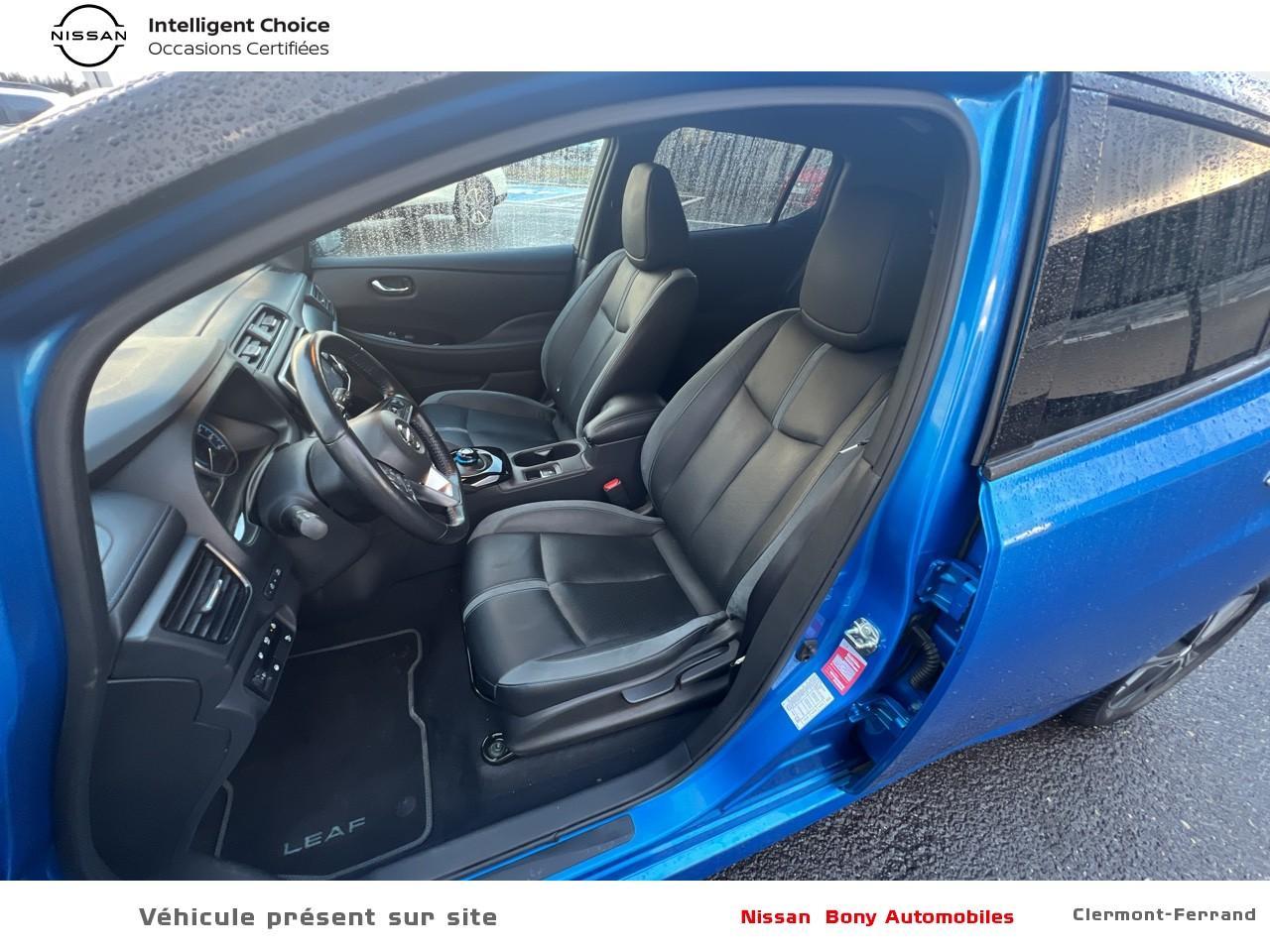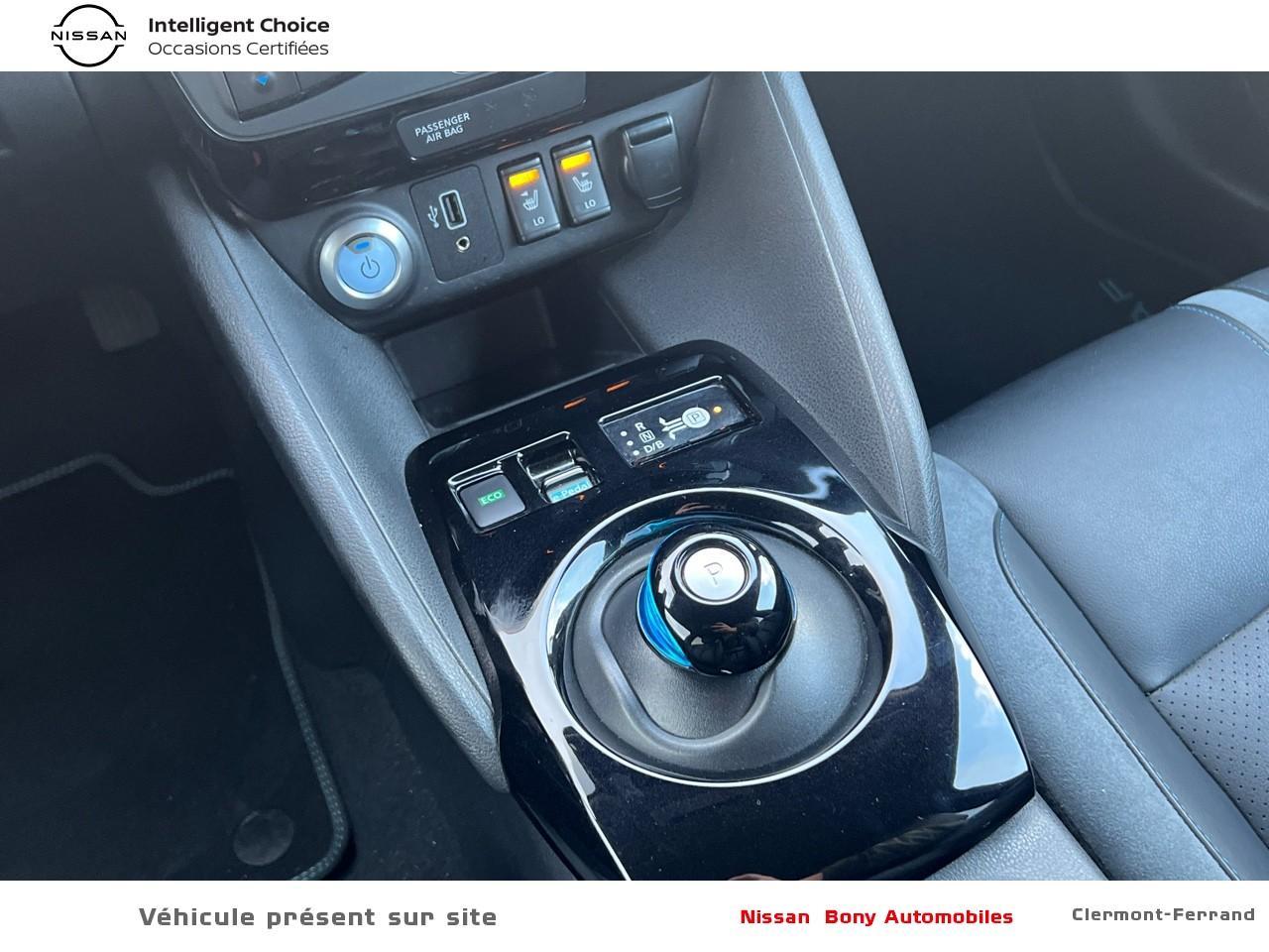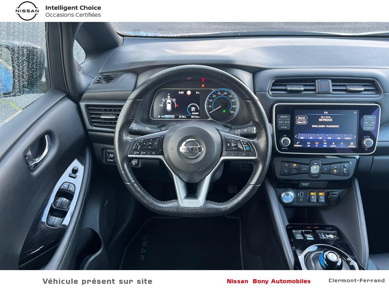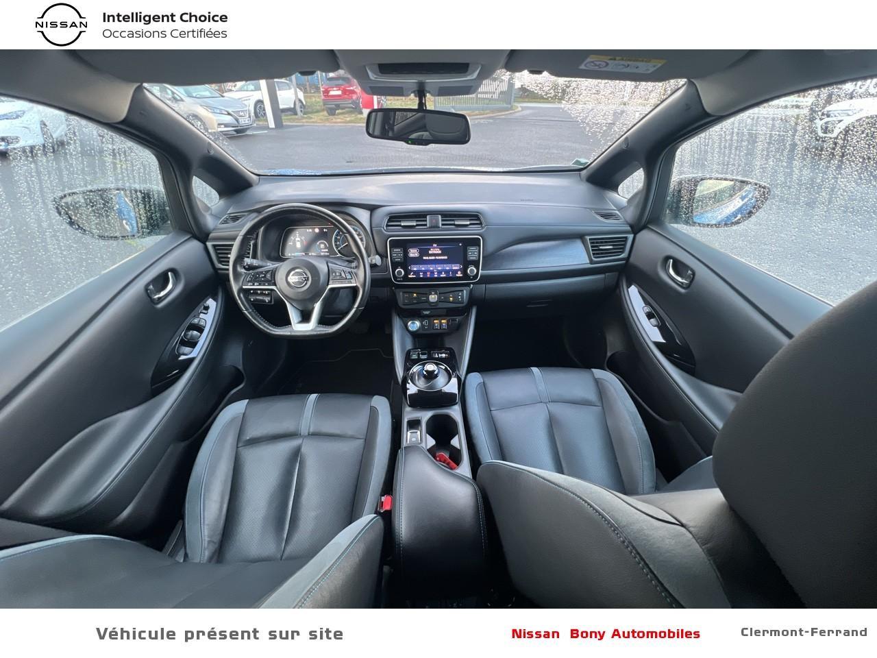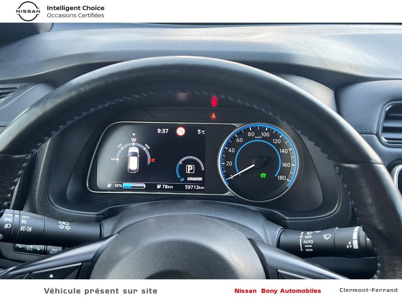 • ABS et EBD• Allumage automatique des feux• ESP• Jantes alliage 17"• Poches aumonières au dos des sièges AV• Poignées de portes chromées• Siège conducteur réglable en hauteur• Volant cuir• Système de contrôle de la pression des pneus• Vitres AR surteintées• Rétroviseurs extérieurs rabattables électriquement• Rétroviseurs extérieurs dégivrants• Allumage automatique des feux• Essuie-glace AV à déclenchement automatique• Système d'ouverture et de démarrage sans clé "Intelligent key"• Points d'ancrage pour sièges enfants ISOFIX à l'AR• Volant chauffant• 6 Airbags : frontaux, latéraux, rideaux• Aide au démarrage en côte• Pompe à chaleur• Déclenchement de la recharge à distance• Sièges AV/AR chauffants• Mode de conduite ECO• Mode de conduite "B"• Alerte de franchissement de ligne• Surveillance des angles morts• Programmation de la recharge• Rétroviseur intérieur électrochromatique• Feux antibrouillard AV• Freinage d'urgence intelligent (AEB) avec détection piéton• Reconnaissance des panneaux de signalisation• Prévention de franchissement de ligne intelligent• Technologie E-pedal• Frein de stationnement électrique• Radars de stationnement AV et AR• Régulateur de vitesse intelligent• Nissan AVM - Vision Intelligente à 360°• Système "Chassis Control" (contrôle actif de trajectoire et de l'assiette)• Limiteur et régulateur de vitesse• Système d'alerte anticollision AR intelligent• Rétroviseurs extérieurs couleur carrosserie avec clignotant à LED intégré• Déclenchement de la climatisation à distance• Vitres électriques à l'AV et à l'AR• Feux diurne LED avec signature lumineuse• Combiné d'instrumentation avec écran HD TFT 7" couleur• Câble de 6m (pour recharge en 21h)• Câble 32A de 6m (pour recharge en 7h)• Chargeur embarqué de 6,6kW (pour recharge en 7h sur une wallbox de 32A)• Connecteur pour chargeur rapide CHAdeMO (recharge à 80% en 40 min)• Montant central de porte noir laqué
